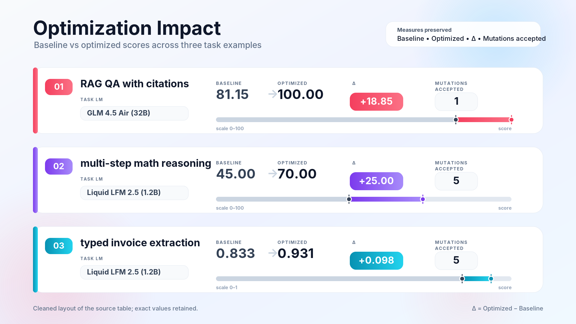 But for a demo, a no-op is a boring story. So I went looking for a task-model/task combination that produced enough failure signal for GEPA to actually exercise. Most of the smaller free-tier models I tried had disqualifying problems: Gemma 3 4B on OpenRouter rejects system prompts outright, and several others hit structural format-output limits that make Pydantic-typed extraction impossible. Above 8B, grade-school math and typed extraction are already solved. Liquid LFM 2.5 at 1.2B was the smallest free-tier model I could find that still accepts the DSPy prompt shape, and it ended up being the sweet spot for this demo.