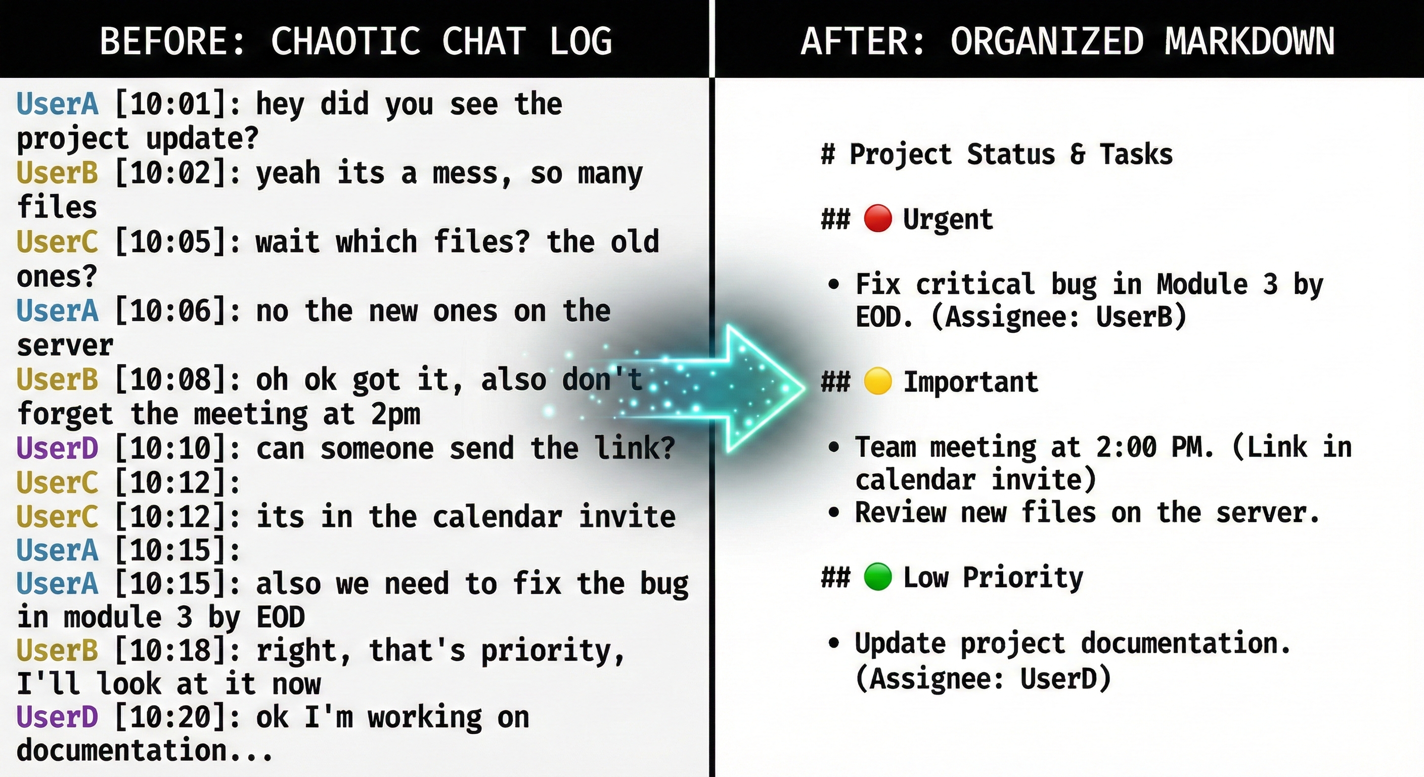 - Produces a clean long-term memory document: identity, projects, preferences, communication patterns